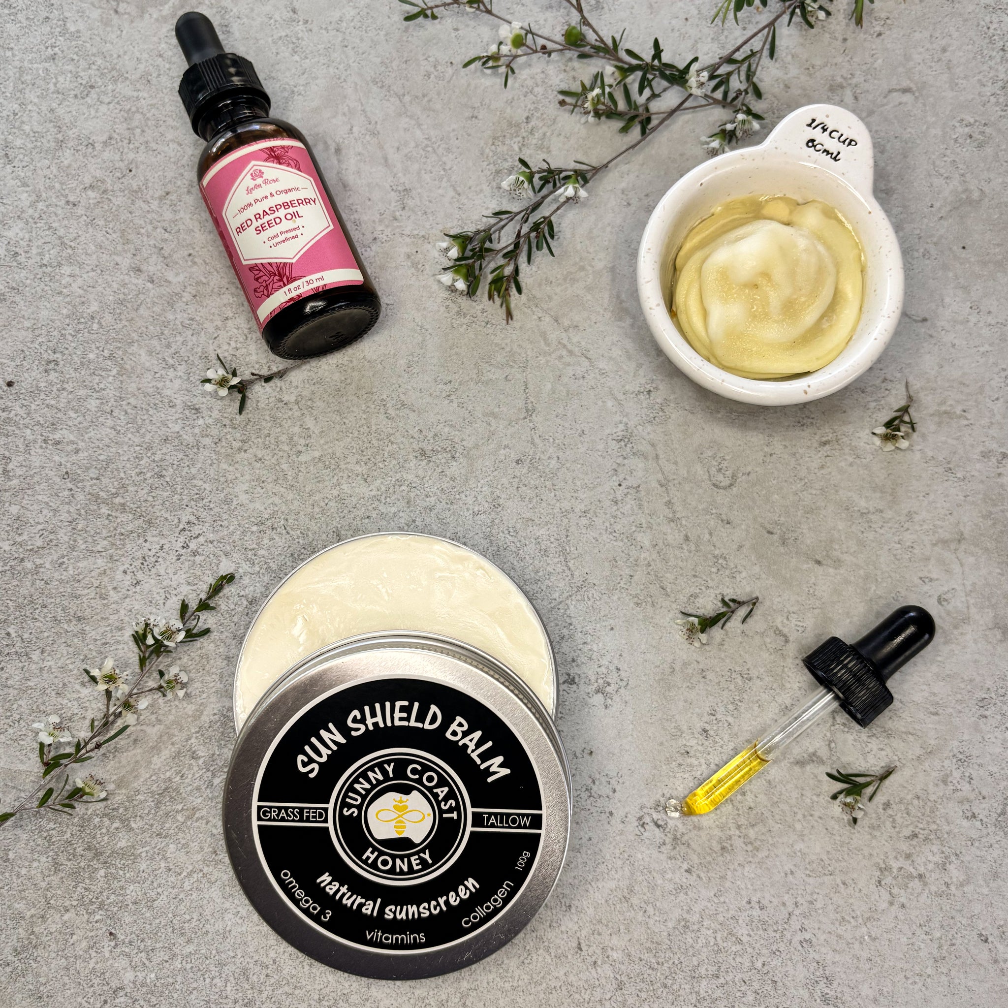 This natural sunscreen, is made with grass fed tallow, zinc oxide and Red Raspberry essential oil which helps protect and nourish your skin from the sun.